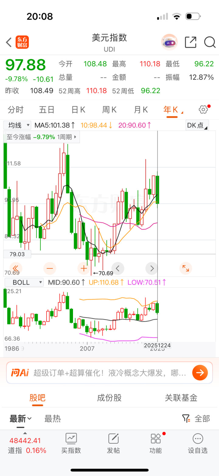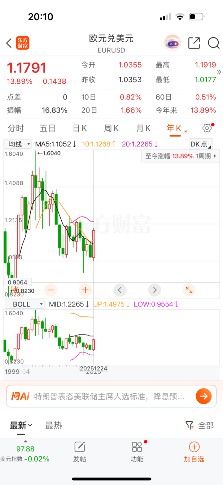 今年以来到记者截稿时止,美元指数累计下跌了9.78%,意味着美元对全球主要货币出现大幅贬值,其中欧元对美元升值13.89%,英镑对美元升值7.98%,澳元对美元升值8.47%。