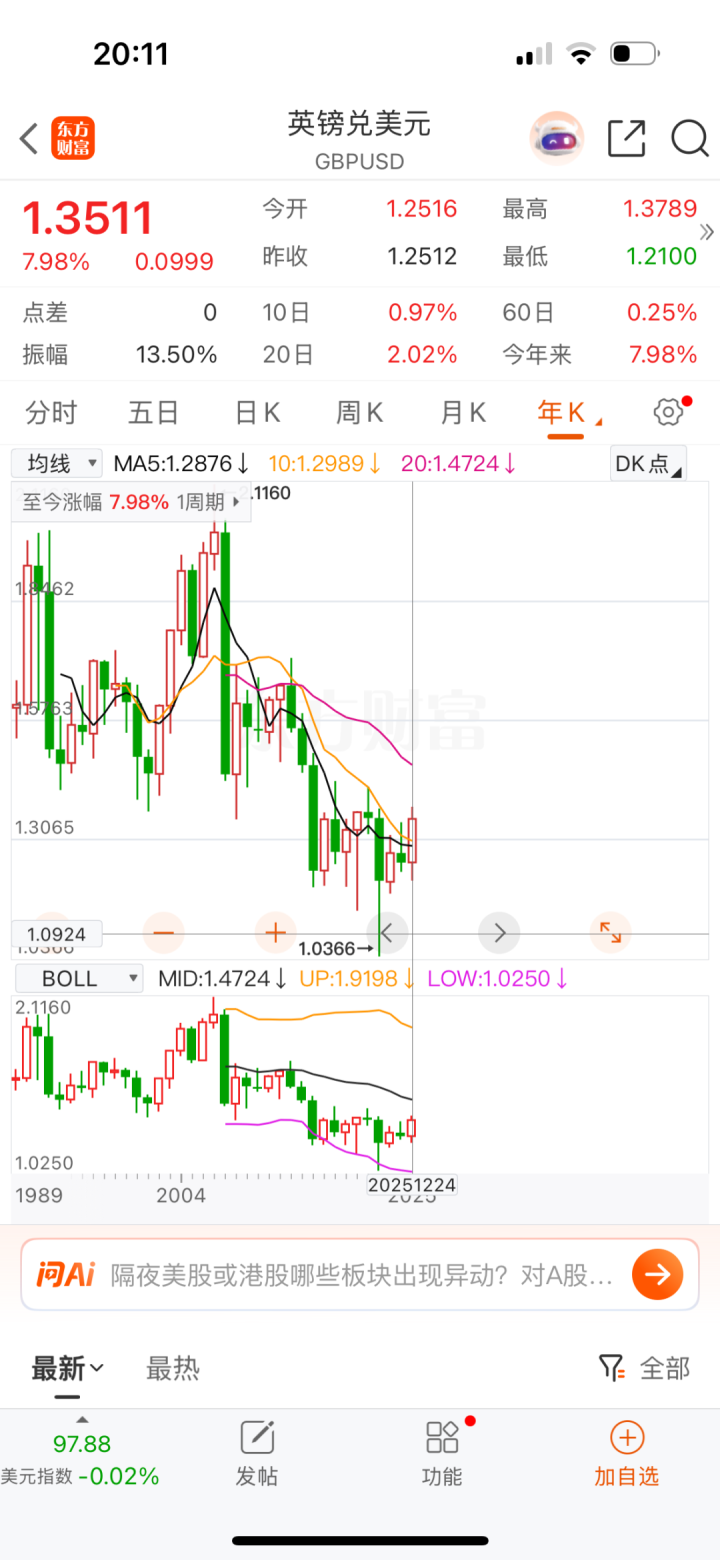 今年以来,人民币兑美元整体震荡上扬态势。2024年12月31日收盘,离岸人民币兑美元汇率为7.3368,到2025年12月24日的盘中最高点,一年涨幅达到4.57%。