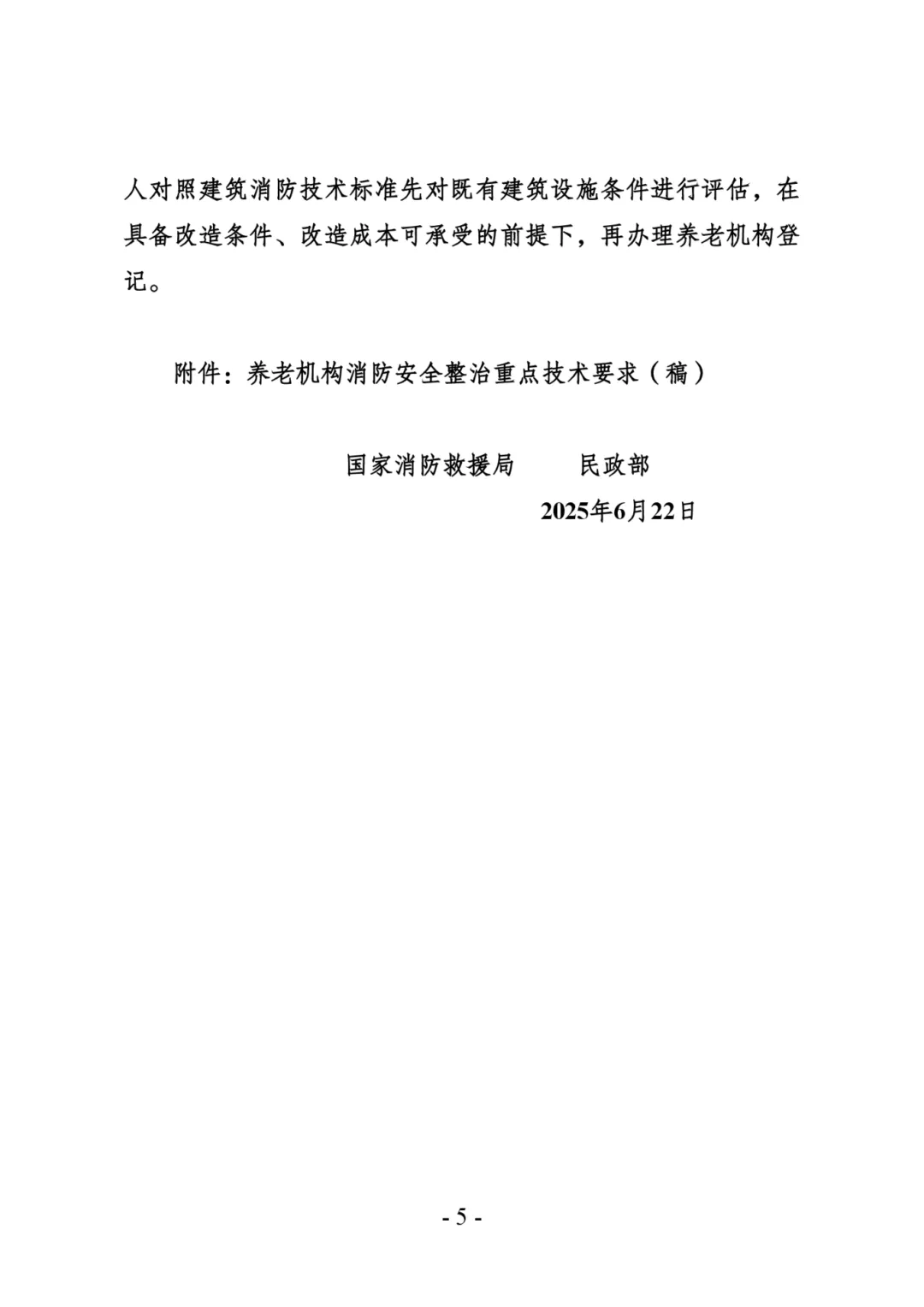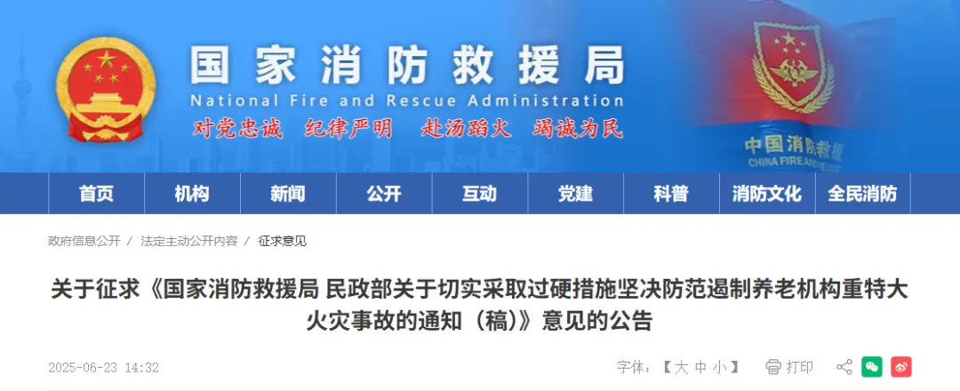 为深刻汲取近期火灾事故教训,切实加强养老机构消防安全监管工作,国家消防救援局、民政部共同研究起草了《国家消防救援局民政部关于切实采取过硬措施坚决防范遏制养老机构重特大火灾事故的通知(稿)》。公众可在2025年7月23日前,通过以下途径和方式提出意见: